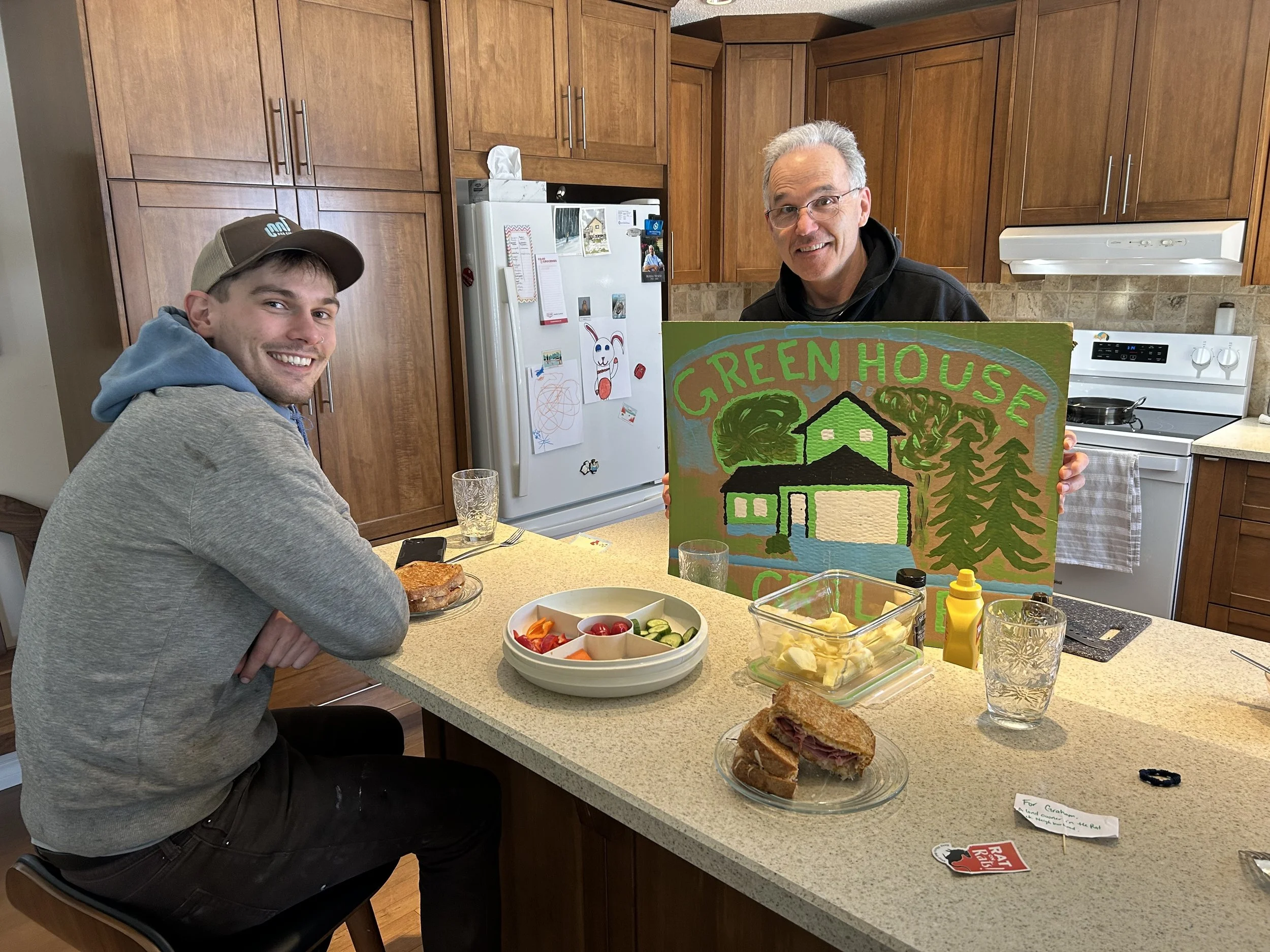 I think spring is here. I mean I think spring is finally here. It feels as though it has been an extra long winter this year. But some of the tell tale signs of the seasonal change over have occurred. Namely Joe (pictured bbq’ers left) and myself did our first outdoor playground job of the year! It was a sunny day in my hometown of Fort Saskatchewan, we swapped some slide components and then were fortunate enough to be able to make a pitter at the Green House Grill. The chef was my very own father, Norm (holding sign originally built as part of a Christmas gift), and I can honestly say, the reuben was exquisite. We even got to watch the chef in action as he constructed and cooked them to order. Joe noted how perfectly grilled it was saying something like ‘ooey gooey’ about the cheese. I can’t quite remember the exact quote. Oozey goozey… slippy, slappy… anyway.